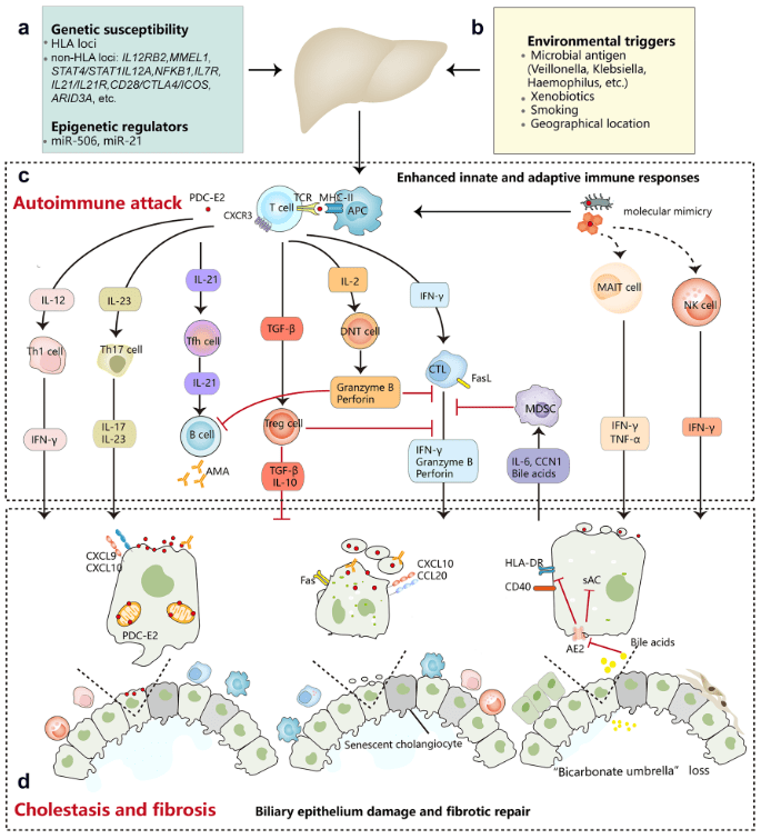 É evidente, no entanto, que a doença surge com (ou por) anormalidades no sistema imunológico, que passa a destruir os canalículos biliares, sugerindo que trata-se de uma doença autoimune. Ela é frequentemente encontrada em associação com outras doenças autoimunes, como tireoidites. Além disso, a presença de anticorpo anti-mitocôndria é quase constante nos portadores (o que não significa que a doença seja causada por esse anticorpo). Vários agentes infecciosos, vírus e bactérias, já foram “acusados” de ser gatilhos desencadeadores do erro no sistema imunológico, mas nenhum de forma conclusiva.