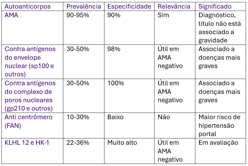 O anticorpo anti mitocôndria (AMA) está presente em cerca de 90-95% dos portadores, especialmente o AMA subtipo M2. Dos poucos portadores com AMA negativo, a grande maioria tem sorologia FAN positiva, especialmente nos padrões gp210 e sp100, que indicam doença mais grave.