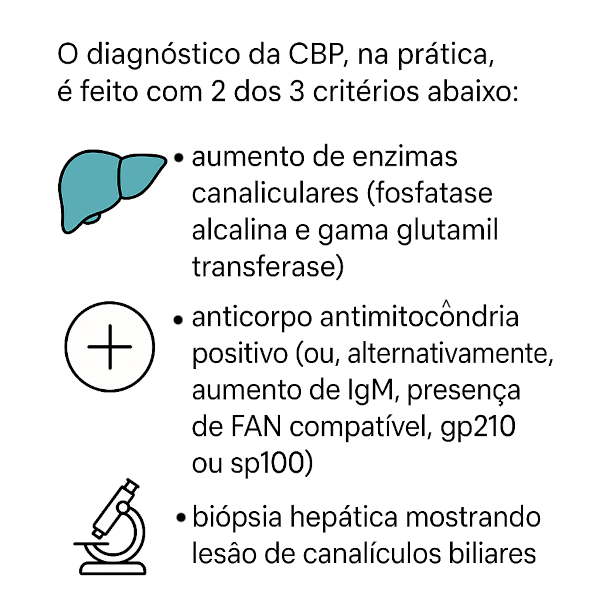 O diagnóstico da CBP, na prática, é feito com 2 dos 3 critérios abaixo: