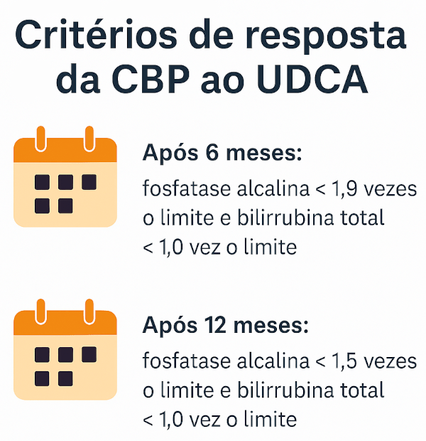 Os estudos realizados sobre o benefício do UDCA a longo prazo na CBP, evidenciam redução na progressão da doença, óbito ou necessidade de transplante. Acredita-se que o tratamento seja especialmente eficaz na fase pré-cirrótica, quando os benefícios em termos de progressão da doença são mais acentuados. Um estudo recente mostra que, se em 6 meses de tratamento, o portador mantiver a fosfatase alcalina acima de 1,9 vezes o limite do laboratório indica que muito provavelmente não responderá adequadamente ao tratamento ao final de 1 ano e portanto já podemos passar para uma segunda opção de tratamento.