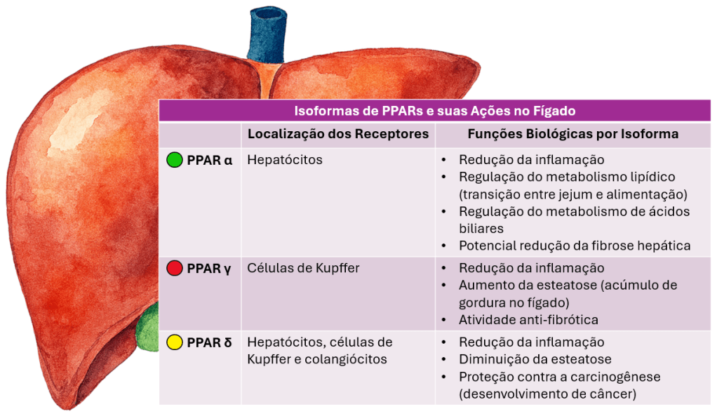 Os receptores PPAR (do inglês Peroxisome Proliferator-Activated Receptors) são proteínas que atuam dentro das células regulando genes ligados ao metabolismo das gorduras, à inflamação e à fibrose. Uma nova classe de medicamentos, os agonistas PPAR não-fibratos, (seladelpar e elafibranor), atuam sobre esses receptores especificamente no fígado, mostrando resultados promissores em não respondedores ao ácido ursodesoxicólico (UDCA) sozinho. Eles parecem reduzir a inflamação, melhorar a eliminação de ácidos biliares e diminuir a fibrose, o que se traduz em melhora nos exames de função hepática — especialmente na fosfatase alcalina, um marcador importante da colestase. Além disso, o perfil de efeitos colaterais tem sido favorável, o que reforça seu potencial como opção complementar de tratamento.