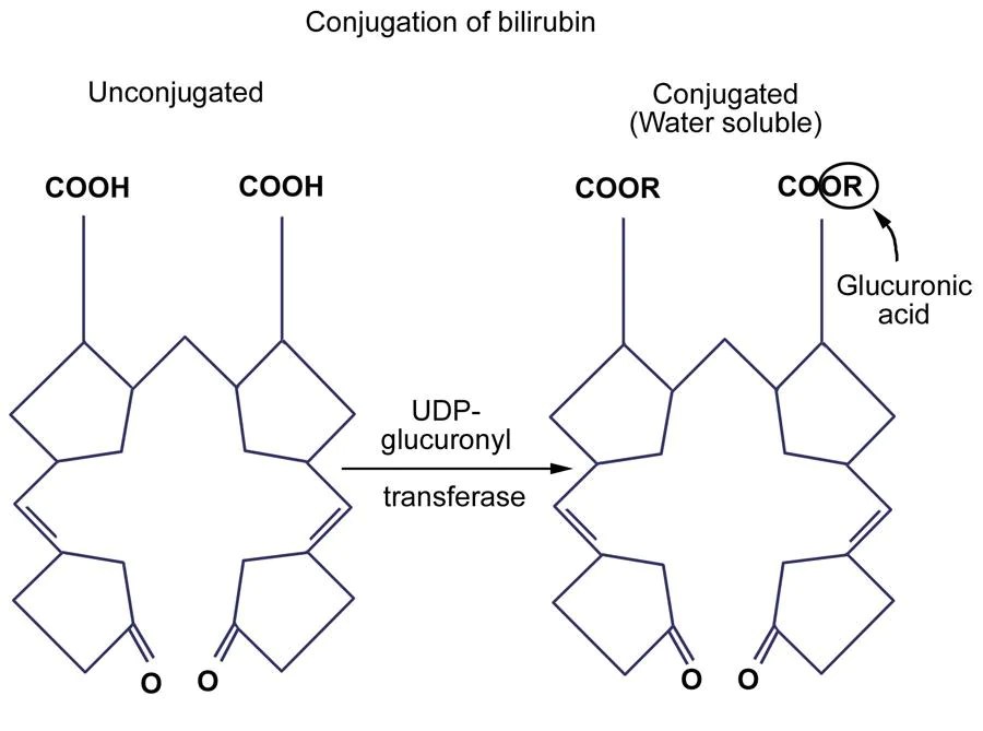 Acontece que essa enzima é codificada por um gene chamado de UGT1A1. Esse gene pode ter diversos erros diferentes (já foram observadas mais de 130 mutações!), que reduzem a sua função em até 30%. Essa porcentagem é suficiente para a pessoa viver muito bem, mas em algumas situações ou há excesso de bilirrubina indireta para conjugar, ou uma série de fatores reduz mais ainda a atividade da enzima. Então começa a haver acúmulo de bilirrubina indireta e a icterícia aparece. Quando esses fatores se resolvem, a icterícia desaparece sem deixar nenhuma consequência.