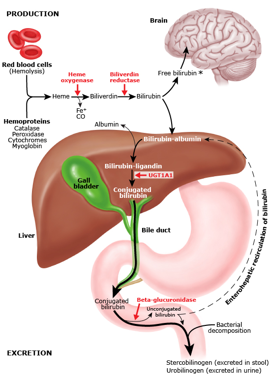 O metabolismo da bilirrubina começa com as hemácias, as células vermelhas do sangue. Essa células são abarrotadas de hemoglobina, aquela proteína que carrega oxigênio e gás carbônico dos pulmões para todo o organismo, e vice versa. Acontece que as hemácias tem seu “prazo de validade” ao redor de 120 dias. Quando ficam velhas, são destruídas no baço e as hemoglobinas no seu interior são degradadas em biliverdina e depois em bilirrubina indireta (também chamada de “não conjugada”), que chega no fígado diretamente pela veia esplênica.