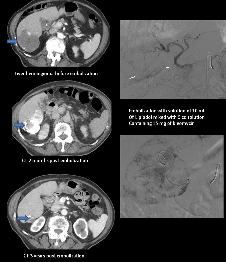 Um tratamento não cirúrgico cada vez mais utilizado é a embolização do tumor. O radiologista passa um cateter por uma veia, que chega até o vaso que fornece sangue para o hemangioma. Então o radiologista pode ou não injetar uma substância esclerosante (para “queimar”), seguida de outra substância (como pedacinhos de espuma) que entope o vaso. Isso faz com que o hemangioma regrida com o tempo.