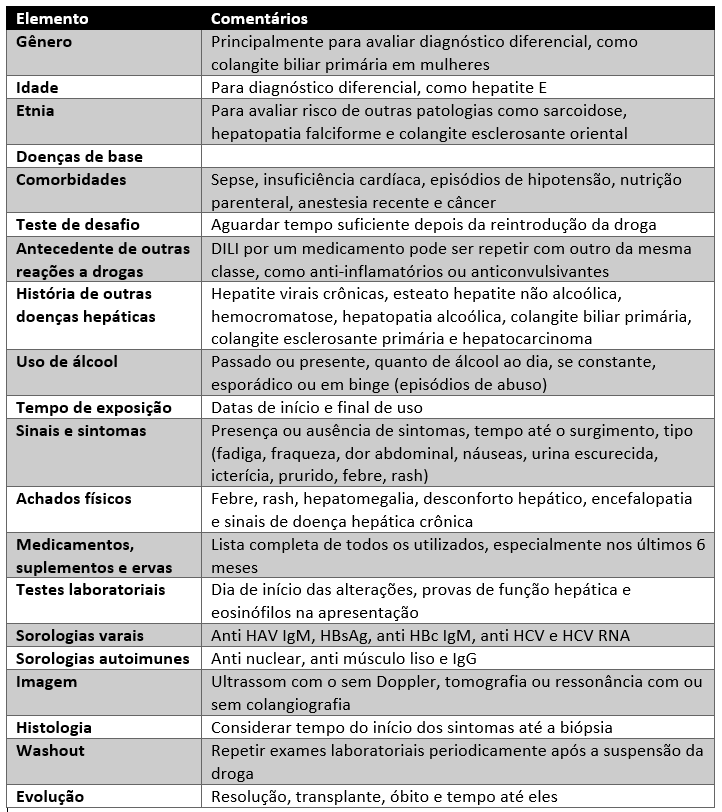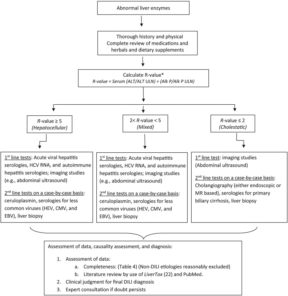 Há diversos algoritmos, ou “caminhos” para o diagnóstico da DILI, mas todos dependem de opiniões de especialistas, levando em consideração a experiência pessoal de cada um deles aliada às doenças mais comuns onde estão e a disponibilidade de exames onde trabalham. Nenhum deles foi comparado adequadamente e considerado superior aos outros, então cada médico pode escolher o caminho que achar mais adequado. Recomenda-se, no entanto, encaminhar paciente para avaliação por hepatologista se o paciente for sintomático e, especialmente nos pacientes ictéricos com ou sem sinais de insuficiência hepática, encaminhar para serviço médico de nível terciário. Nos demais, não esquecer de realizar a investigação básica abaixo: