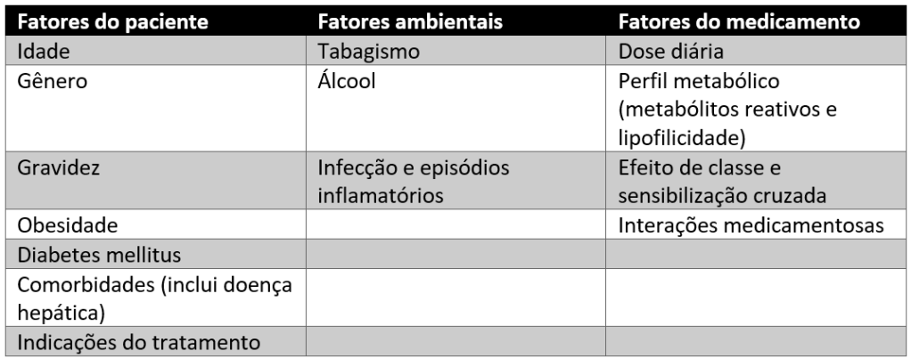 Não há diferença de risco dependendo do gênero, mas vale notar que mulheres estão mais propensas a apresentar um quadro muito semelhante a hepatite autoimune causada por metildopa, nitrofurantoína, diclofenaco e minociclina. Gestantes, por outro lado, estão parcialmente protegidas de DILI pois evitam automedicação e médicos também medicam muito menos, mas estão expostas ao risco de lesão pela metildopa e hidralazina, já que são as drogas de escolha para hipertensão na gestação.