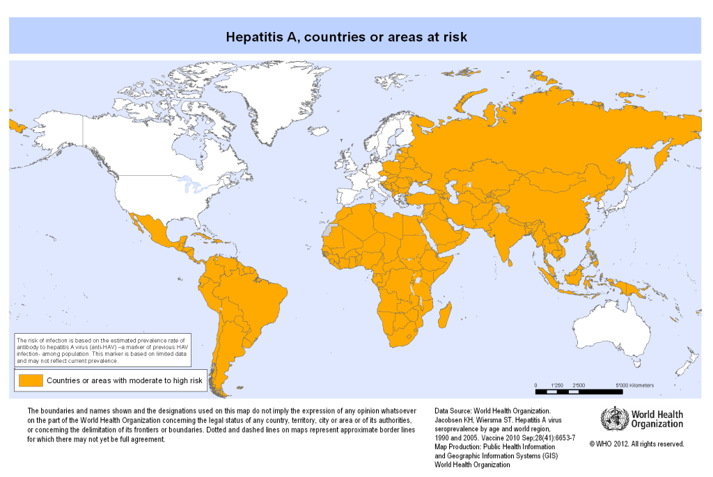 Transmissão fecal-oral significa que o vírus é eliminado nas fezes e, quando é ingerido entra pelas paredes do intestino e vai até o fígado, onde se multiplica danificando os hepatócitos (células do fígado) e causando inflamação. A infecção ocorre portanto quando há falta de higiene (não lavar as mãos após ir ao banheiro, o que é particularmente importante quando é alguém que manipula comida) ou, menos frequentemente, em algumas práticas sexuais. Além da falta de higiene, baixas condições socioeconômicas com falta de saneamento leva ao consumo de água contaminada. Com isso tudo, é fácil entender porque a hepatite A é encontrada mais em países “em desenvolvimento” (onde até 90% da população já pegou) e leva a epidemias nos países desenvolvidos, onde a infecção na infância é menos comum e a população adulta entra em contato com o vírus pela primeira vez, sem ter anticorpos.