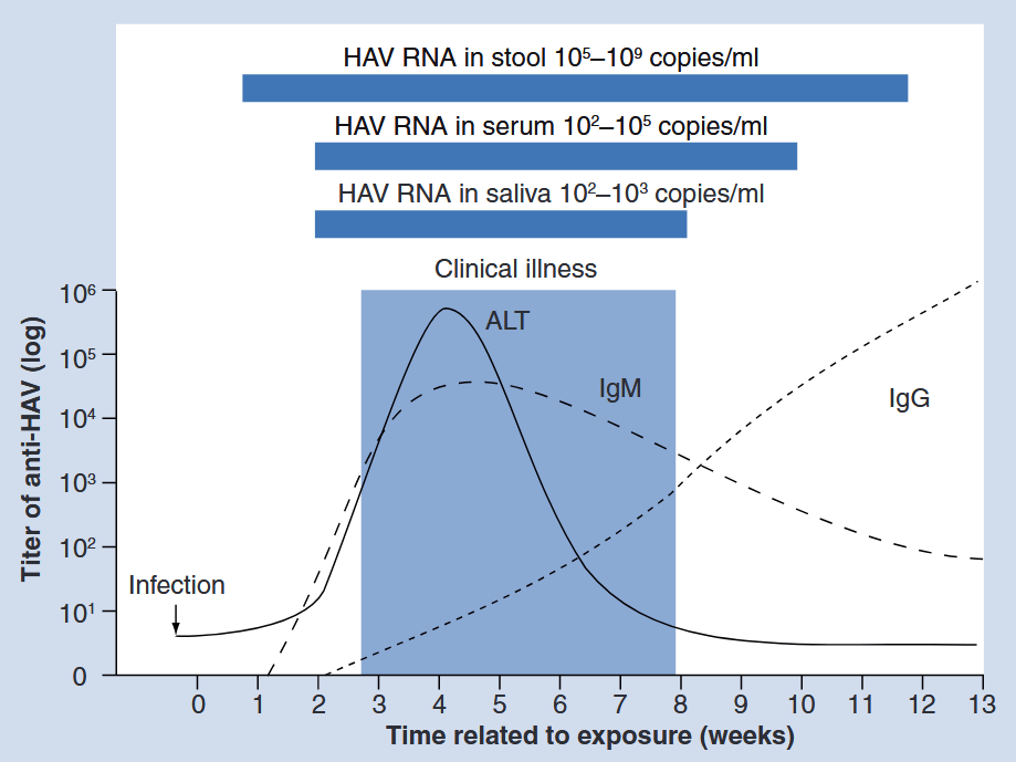 A confirmação da hepatite A aguda pode ser feito pela pesquisa de ácido nucleico (NAT) no sangue, que seria o “padrão ouro”, mas na prática o que fazemos é a sorologia, que dosa anticorpos contra o vírus. O anticorpo do tipo IgM já está positivo quando os sintomas surgem (já que os sintomas surgem exatamente pela resposta imune) e fica positivo por 3 a 6 meses, mas pode durar até 12 meses. Logo depois de surgir o IgM, o organismo já começa a produzir o IgG, que é um anticorpo melhorado e vai gerar proteção persistente. O anticorpo antiVHA IgG persiste por anos no sangue, mas mesmo quando desaparece a sua informação fica “arquivada” e volta a ser produzido assim que algum outro vírus A entra no corpo, impedindo novas infecções.
