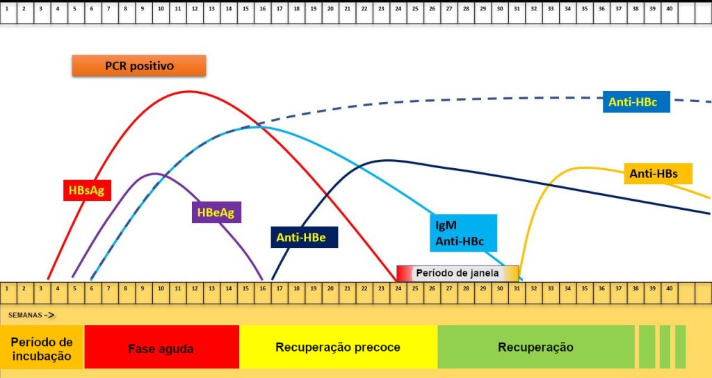 Assim que o HBsAg é detectado, o sistema imunológico responde com toda a sua fúria: linfócitos T CD4 e CD8, citocinas virais e os anticorpos, inicialmente o antiHBs e, assim que outras partes do vírus são reconhecidas, o antiHBc (inicialmente o IgG, depois o IgG e o antiHBe. Está desencadeada a hepatite B aguda propriamente dita, que é o vírus de um lado tentando se multiplicar mais rápido que o sistema imunológico pode contê-lo, e do outro o sistema imunológico destruindo todas os hepatócitos que mostram o mínimo sinal de infecção.