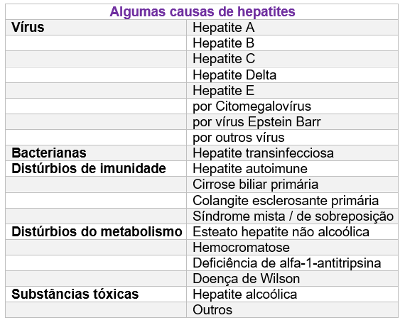 As hepatites podem ter várias causas. As hepatites virais são todas diferentes em sintomas, gravidade, evolução e tratamento. Algumas são conhecidas como vírus de hepatite pois atacam quase que exclusivamente as células do fígado, e demos a elas letras ou invés de nomes para facilitar (vírus das hepatites A, B, C e Delta, por exemplo). Outras atacam múltiplos órgãos e a infecção pode se manifestar de forma diferente dependendo do órgão mais afetado (como a dengue, febre amarela e infecções pelo citomegalovírus, vírus Epstein Barr e outros).