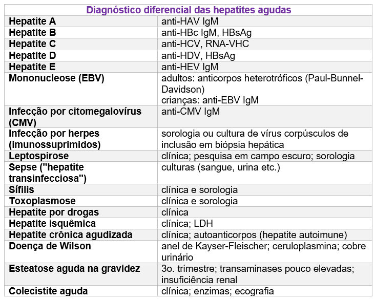 - Alguns casos que se apresentam como hepatite aguda na verdade são doenças crônicas em fase de cirrose cujos sintomas foram desencadeados por alguma complicação, sendo necessário também descobrir qual seria esse fator desencadeante; nesses casos espera-se outros sintomas mais característicos de doença crônica, como ascite ou hemorragia por varizes esofágicas.