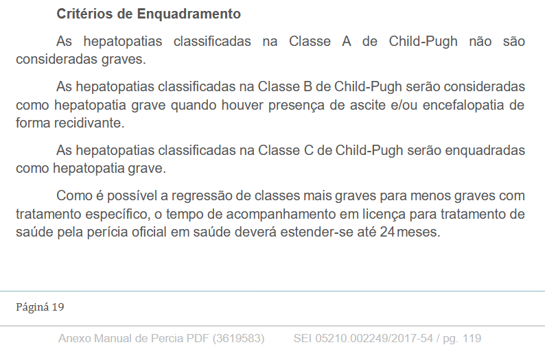 - Ministério da Economia / SIASS. Manual de Perícia Oficial em Saúde do Servidor Público Federal – 3ª Edição (2017). Inclui capítulo sobre critérios de avaliação de “hepatopatia grave” com base no Consenso da SBH. Disponível em: https://www.gov.br/anac/pt-br/centrais-de-conteudo/publicacoes/arquivos/manual-de-pericia-oficial-em-saude-do-servidor-publico-federal-3a-edicao-ano-2017.pdf