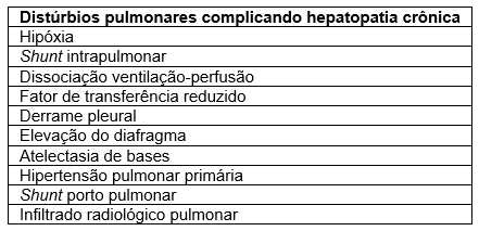 Cerca de 1/3 dos pacientes com cirrose descompensada têm saturação arterial de oxigênio reduzida e, algumas vezes, cianose. A Síndrome Hepatopulmonar é caracterizada como uma tríade: doença hepática, dilatação vascular intrapulmonar e hipoxemia arterial. Apesar da SHP ser uma causa infrequente de hipoxemia em adultos e crianças com hepatopatia (5-29%), pode resultar em hipoxemia (PaO2 < 50 mmHg) severa e debilitante, com necessidade de oxigenioterapia contínua.