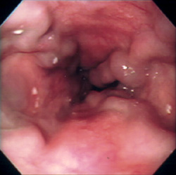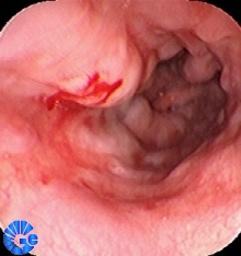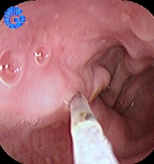 Escleroterapia de varizes esofágicas. O objeto branco à esquerda é o cateter com agulha, que está no interior da variz (Gastrocentro – Unicamp)